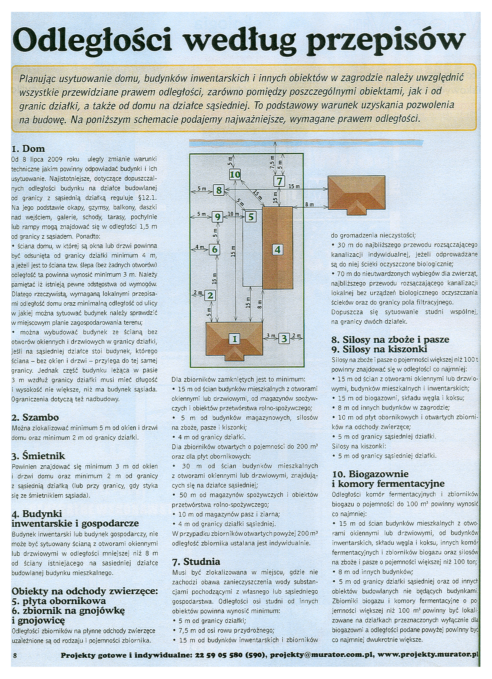 Planując budowę domu, miejsc do wypoczynku dla gości, szamba, studni, itd. w zagrodzie wiejskiej koniecznie należy znać wynikające z przepisów prawa odległości, które koniecznie trzeba zachować, by tego rodzaju niezbędne elementy infrastruktury nie wpływały negatywnie na bezpieczeństwo w zagrodzie i nie utrudniały życia mieszkańcom, wydzielając np. w pobliżu okien czy miejsc wypoczynku nieprzyjemne zapachy. Zagadnienia te omawia szczegółowo artykuł opublikowany w wydawnictwie "Murator - projekty" Jesień 2010, który zamieszczamy w załączniku - do czytania i stosowania.