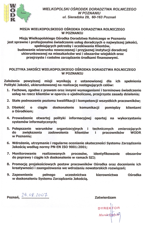 Wszystkie usługi realizowane przez pracowników Wielkopolskiego Ośrodka Doradztwa Rolniczego w Poznaniu objęte są gwarancją jakości.