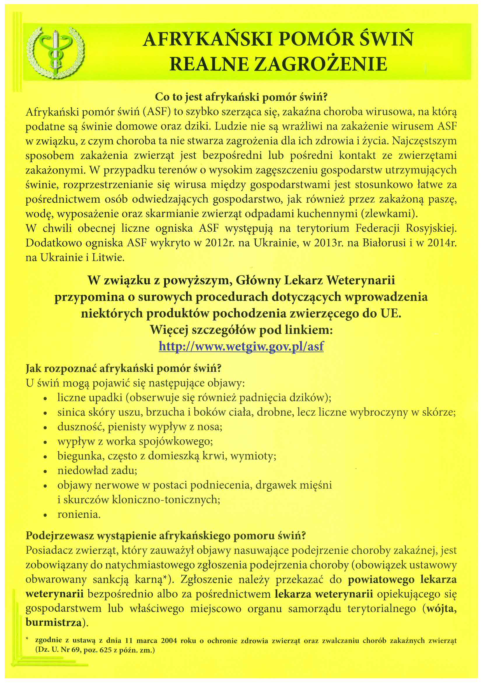 W dniu 16 sierpnia 2016r. w Starostwie Powiatowym Międzychód odbyło się spotkanie powiatowych instytucji rolniczych oraz hodowców w celu oceny sytuacji i ewentualnych działań w sprawie afrykańskiego pomoru świń. Spotkanie zorganizowane zostało przez Powiatową Izbę Rolniczą w Międzychodzie w porozumieniu z Powiatowym Inspektoratem Weterynarii. Na spotkaniu omówiony został problem szybko szerzącej się zakaźnej choroby wirusowej. Przez uczestników spotkanie zostały zaproponowane możliwe działania, które mogłyby pomóc w opanowaniu zagrożenia. Wszystkie propozycje zostaną przekazane Wojewódzkiemu lekarzowi Weterynarii. Dodatkowe informacje na temat afrykańskiego pomoru świń: http://www.wetgiw.gov.pl/asf